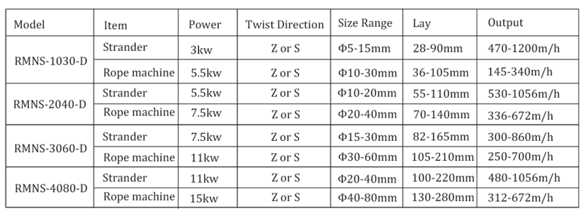 The machine can twist different size of HDPE, PP monofilament, PP tape yarn, PP split-film, Polyester yarn, Nylon yarn, Cotton yarn, Sisal, Jute to 3, 4 or 6 strands rope. The machine has the characteristics of simple structure, easy maintenance, economic applicability.